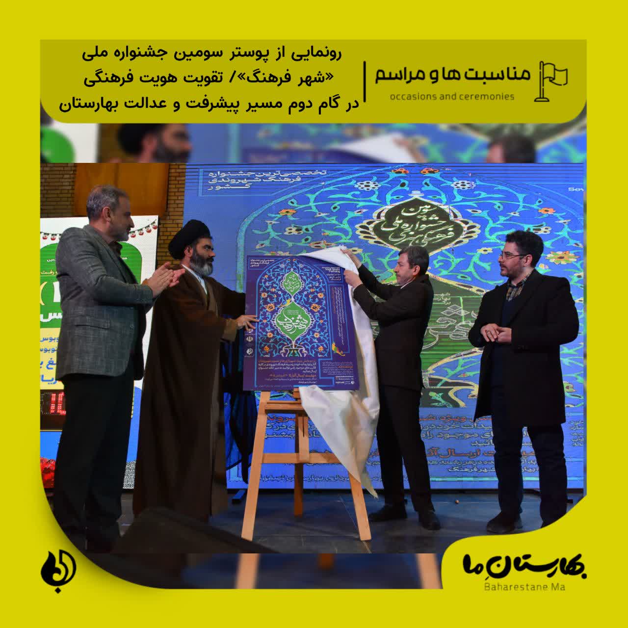 در حاشیه جشن بزرگ میلاد حضرت امام زمان (عج)، پوستر سومین جشنواره ملی فرهنگیهنری «شهر فرهنگ» با حضور دکتر جمالینژاد استاندار اصفهان در شهر بهارستان رونمایی شد؛ اقدامی در راستای تقویت هویت فرهنگی و اجتماعی شهر در گام دوم مسیر پیشرفت و عدالت در شهر بهارستان.